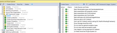 In this explorer view, left panel represents the default rule groups of the project, and their subgroups if any. For example, in the image, our code seems to violate one or more of the rules or sub-rules of the ".NET Framework Usage" rule group. Keep in mind that if all of the rules or sub-rules are not satisfied, those warning signs are inevitable. For example, even tough our code satisfied the most of the code rule queries of the "System" sub-rule of the ".NET Framework Usage" rule group, the parent node shows a warning sign instead of a success color. This great feature allows us to create new project rules, or delete an existing one, or import any predefined rule in the .ndrules format from outside. Well, that is very cool feature because this enables developers to create a standard in writing code in common sense.